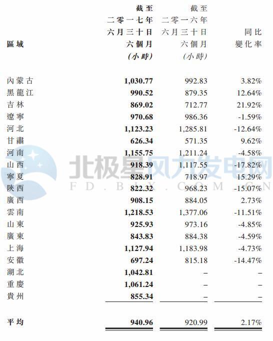 大唐新能源2017上半年風(fēng)電場按地區(qū)平均利用小時(shí)數(shù)據(jù)