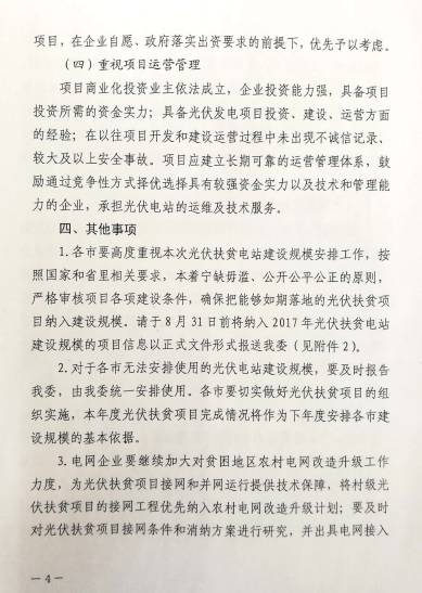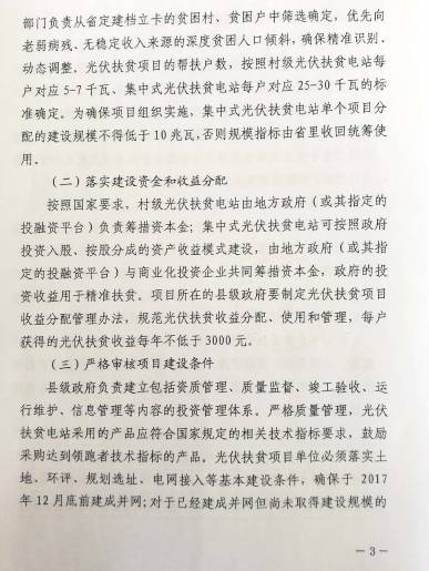 此外,文件要求光伏扶貧電站需于2017年底前并網(wǎng),集中式光伏扶貧電站單個(gè)規(guī)模不低于10MW,否則將由省級(jí)收回指標(biāo)統(tǒng)籌安排。