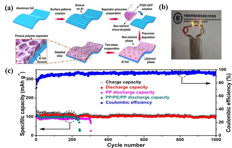 中國儲(chǔ)能網(wǎng)訊:近日,中國科學(xué)院深圳先進(jìn)技術(shù)研究院功能薄膜材料研究中心研究員唐永炳及其研究團(tuán)隊(duì)成功研發(fā)出了一種具有集流體、負(fù)極活性材料、隔膜三重功能的一體化電極,并成功應(yīng)用于高效、低成本的雙離子電池。這種新型結(jié)構(gòu)有效解決了金屬負(fù)極材料在充放電過程中的體積變化劇烈、循環(huán)性能較差的問題,并有利于簡化電池生產(chǎn)工藝,增加電池能量密度。相關(guān)研究成果Multifunctional Electrode Design Consisting of 3D Porous Separator Modulated with Patterned Anode for High-Performance Dual-Ion Batteries(《一種包含有三維多孔隔膜和金屬負(fù)極的多功能電極設(shè)計(jì)及其在高效雙離子電池中的應(yīng)用》)已在線發(fā)表于《先進(jìn)功能材料》(Advanced Functional Materials,DOI:10.1002/adfm.201703035)上。