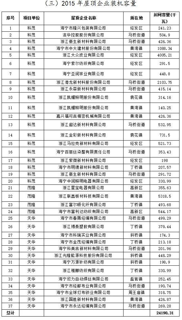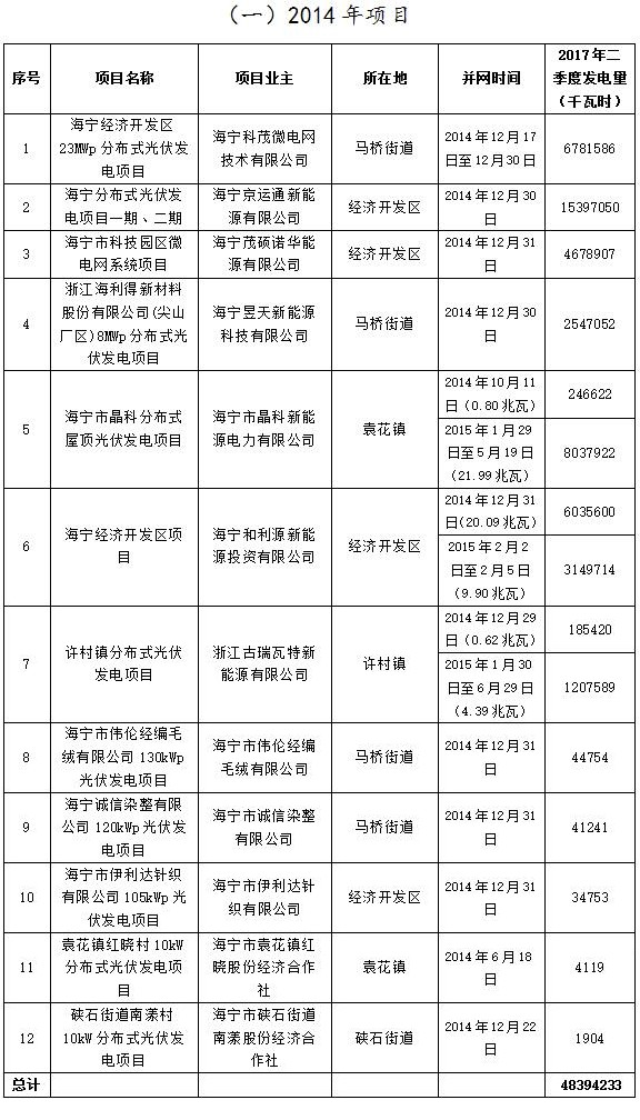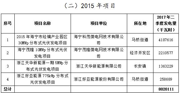 浙江海寧2017Q2分布式光伏項目擬補助發(fā)電量