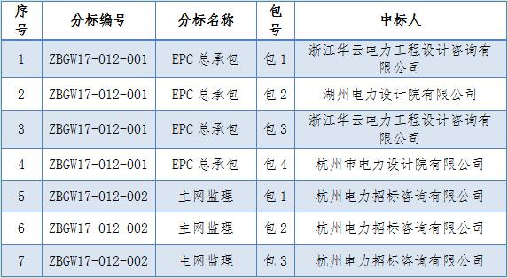 中國儲能網(wǎng)訊:國網(wǎng)浙江省電力公司2017年新能源光伏項目配套工程服務(wù)類招標采購的評標工作已結(jié)束。根據(jù)經(jīng)評標委員會的評審結(jié)果,經(jīng)招標領(lǐng)導(dǎo)小組批準,各標包的中標情況如下: