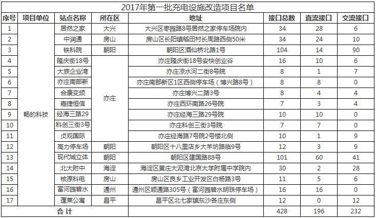中國儲能網訊:6月30日,北京市城市管理委員會發(fā)布了2017年第一批公用充電設施新國標升級改造項目驗收結果。共有17個公共充電樁站點,428個充電接口完成升級改造且通過第三方檢測機構抽檢,其中直流196個,交流232個。