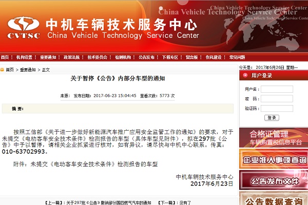 按照工信部《關(guān)于進一步做好新能源汽車推廣應(yīng)用安全監(jiān)管工作的通知》的要求,對于未提交《電動客車安全技術(shù)條件》檢測報告的車型(具體車型見附件),擬在297批《公告》中予以暫停,請相關(guān)企業(yè)抓緊進行核對,如有異議,請盡快與中機中心聯(lián)系。傳真:010-63702993。