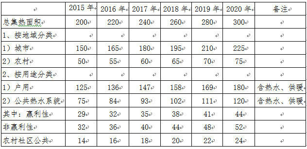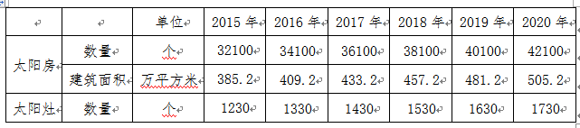 到2020年,全省太陽(yáng)能熱水器集熱面積達(dá)到300萬(wàn)平方米。其中按地域分,城鎮(zhèn)太陽(yáng)能熱水器集熱面積達(dá)到225萬(wàn)平方米;農(nóng)村太陽(yáng)能熱水器集熱面積達(dá)到75萬(wàn)平方米。按用途分,用戶(hù)太陽(yáng)能熱水器集熱面積達(dá)到180萬(wàn)平方米;公共熱水系統(tǒng)太陽(yáng)能熱水器集熱面積達(dá)到120萬(wàn)平方米(包含熱水、供暖),其中盈利性質(zhì)太陽(yáng)能熱水器集熱面積達(dá)到44萬(wàn)平方米,非盈利性質(zhì)太陽(yáng)能熱水器集熱面積達(dá)到52萬(wàn)平方米,農(nóng)村社區(qū)公共太陽(yáng)能熱水器集熱面積達(dá)到24萬(wàn)平方米。累計(jì)建設(shè)太陽(yáng)能暖房42100戶(hù),太陽(yáng)灶1730臺(tái)。詳見(jiàn)表5.2-5和表5.2-6。