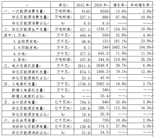 (1)非化石能源消費(fèi)比重。到2020年,一次能源消費(fèi)總量9250萬(wàn)噸標(biāo)煤,非化石能源消費(fèi)總量880萬(wàn)噸標(biāo)煤,占一次能源消費(fèi)比重的9.5%。