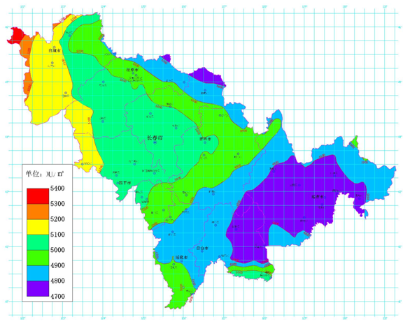 吉林省太陽(yáng)能資源豐富,全省多年平均日照時(shí)數(shù)為2200~3000小時(shí),年太陽(yáng)總輻射量為5051.7兆焦耳/平方米,根據(jù)太陽(yáng)能資源評(píng)估方法(QX/T89-2008),屬資源很豐富級(jí)別,全省太陽(yáng)能資源總體屬于二類(lèi)。