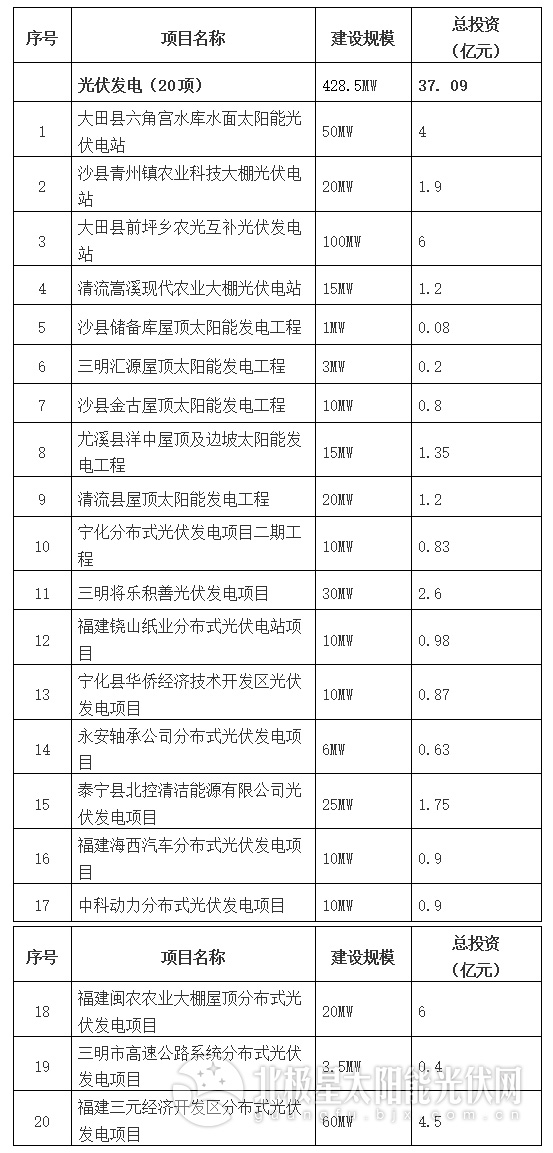 中國儲能網(wǎng)訊:近日,三明市人民政府辦公室關(guān)于印發(fā)三明市“十三五”能源發(fā)展專項(xiàng)規(guī)劃的通知,規(guī)劃羅列了能源建設(shè)的重點(diǎn)項(xiàng)目共72項(xiàng),包括核電、光伏發(fā)電、風(fēng)力發(fā)電、水力發(fā)電、火力發(fā)電、變電站、天然氣、煤礦及電動汽車充換電基礎(chǔ)設(shè)施等項(xiàng)目。其中指出,“十三五”期間規(guī)劃光伏發(fā)電項(xiàng)目20個,共428.5MW,計(jì)劃總投資37.09億元。