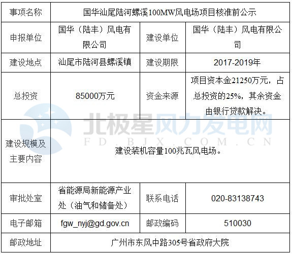 國華汕尾陸河螺溪100MW風電場項目核準前公示