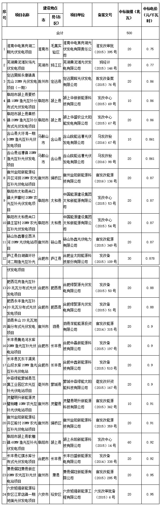 根據(jù)《國家能源局關(guān)于調(diào)整2016年光伏發(fā)電建設(shè)規(guī)模有關(guān)問題的通知》(國能新能〔2016〕383號(hào))精神,我省提前使用2017年度建設(shè)規(guī)模50萬千瓦,追加2016年度普通光伏電站建設(shè)規(guī)模。2016年12月31日,我們通過公開競爭性比選方式,確定了淮南中電焦崗湖二期光伏發(fā)電項(xiàng)目等24個(gè)項(xiàng)目,并報(bào)請(qǐng)國家能源局審核同意。
