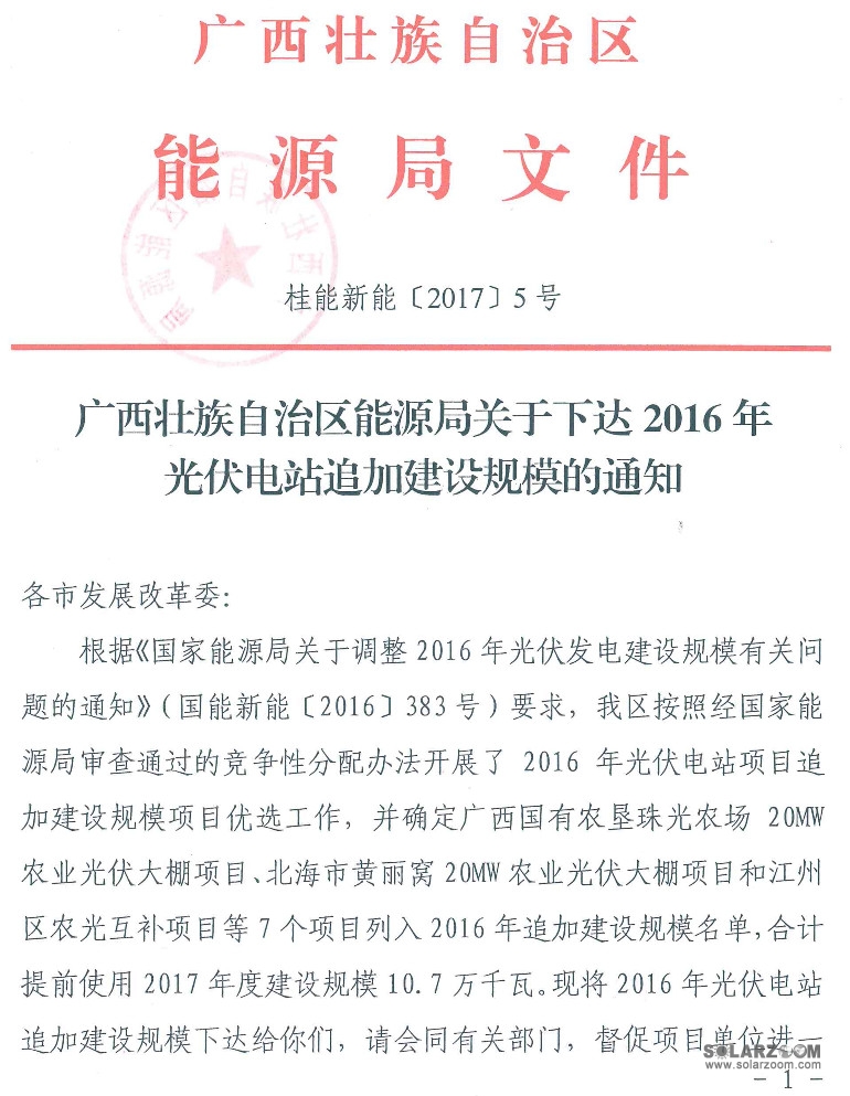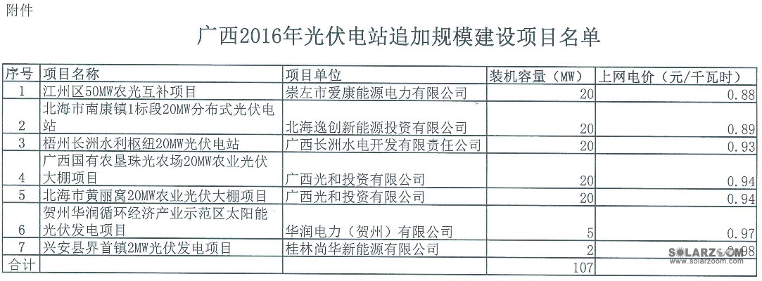 中國儲能網(wǎng)訊:近日,廣西能源局下達(dá)《2016年光伏電站追加規(guī)模的通知》?!锻ㄖ分赋龃舜螐V西共有7個項目列入2016年 追加建設(shè)規(guī)模名單,合計提前使用2017年度建設(shè)規(guī)模107MW。項目不能在2017年6月30日前并網(wǎng)發(fā)電的,追加的建設(shè)規(guī)模作廢。