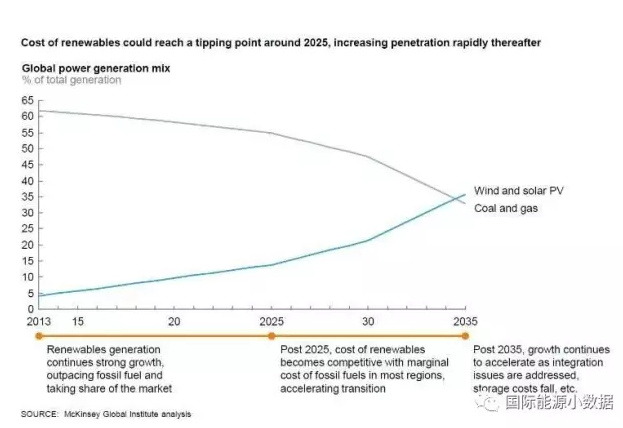 中國儲能網訊:風電、光伏何時真正可以煤電、氣電競爭?知名咨詢公司麥肯錫預測,2025年將是風電光伏與煤電、燃氣發(fā)電競爭的轉折點,屆時風電、光伏成本將在全球范圍內低于煤電、氣電成本。到2035年,風電、光伏在總發(fā)電量的比例將在全球范圍內超過煤電、燃氣發(fā)電的比例。