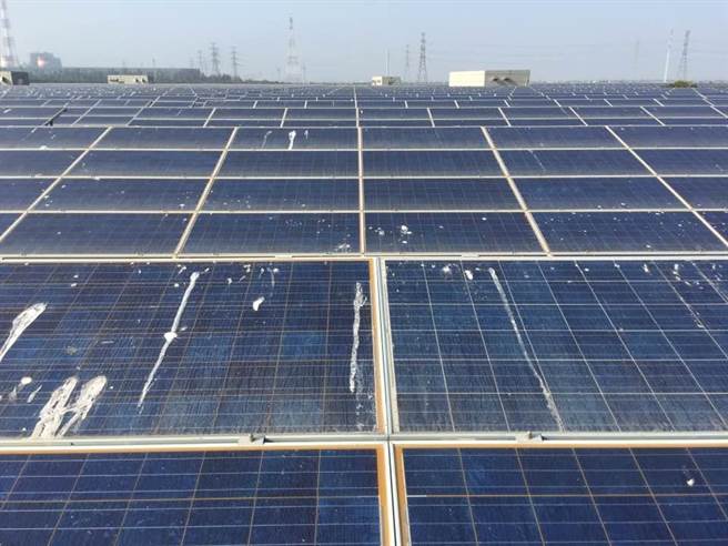 高雄永安鹽灘地太陽(yáng)能光電廠的太陽(yáng)能板,遭鳥糞轟炸,留下白斑點(diǎn)點(diǎn)。(郭韋綺翻攝)