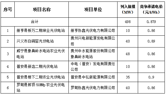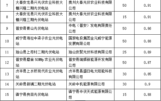 中國儲能網(wǎng)訊:根據(jù)《國家能源局關(guān)于調(diào)整2016年光伏發(fā)電建設(shè)規(guī)模有關(guān)問題的通知》(國能新能〔2016〕383號)文件精神和《貴州省普通光伏電站項目競爭性配置實施辦法(試行)》的要求,2016年貴州省普通光伏發(fā)電項目追加建設(shè)規(guī)模競爭性配置工作,采取企業(yè)自主競價等相關(guān)競爭性要求申報項目、第三方機構(gòu)評選的方式進行優(yōu)選,共有23個項目申報參與競爭性評選,總裝機規(guī)模98萬千瓦。經(jīng)過第三方機構(gòu)評選,共有15個項目獲得優(yōu)選配置規(guī)模,追加總規(guī)模為49.8萬千瓦,經(jīng)國家能源局同意,現(xiàn)予公布。