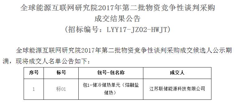 中國(guó)儲(chǔ)能網(wǎng)訊:近日,江蘇聯(lián)儲(chǔ)能源科技有限公司成功中標(biāo)全球能源互聯(lián)網(wǎng)研究院第二批物資競(jìng)爭(zhēng)性談判采購(gòu)儲(chǔ)冷儲(chǔ)熱單元(熔融鹽儲(chǔ)熱系統(tǒng))。
