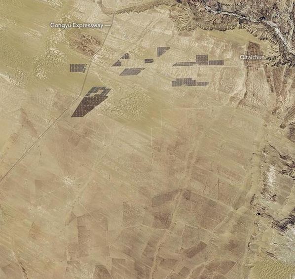衛(wèi)星圖片展示了龍羊峽太陽能發(fā)電場在四年內(nèi)的增長情況。到2017年1月5日,太陽能電池板覆蓋了青海省27平方公里。據(jù)報道,在2017年在該區(qū)域有近400萬塊太陽能電池板。