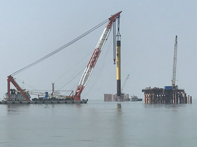 此項目由中鐵大橋局承建施工,建成之后,將成為國內(nèi)首個大功率海上風(fēng)電試驗風(fēng)場。此次安裝的首根風(fēng)機(jī)基礎(chǔ)主體鋼管樁直徑為3.2米,長度50米,重量170噸。