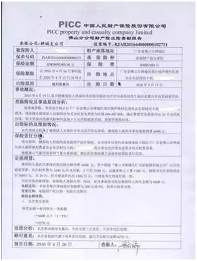 該保險理賠單清楚地展示了被保險的投保金額、理賠金額和事故概況,真實展示了光伏電站的理賠全過程。黎生家的分布式光伏發(fā)電設(shè)備共由26片光伏板組成,2016年4月17日因強(qiáng)對流天氣導(dǎo)致5片光伏板損壞,業(yè)主就5片受損組件向保險公司申請修復(fù)理賠。對此保險公司給出定損理算: