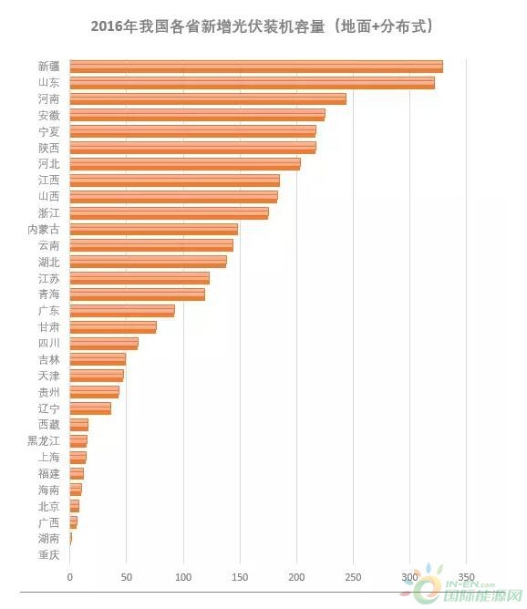 數(shù)據顯示2016年新增裝機超過1吉瓦的省份達到15各。其中:新疆、山東超過3吉瓦。河南、安徽、寧夏、陜西、河北超過2吉瓦。江西、山西、浙江超過1.5吉瓦。內蒙古、云南、湖北、江蘇、青海超過1吉瓦。