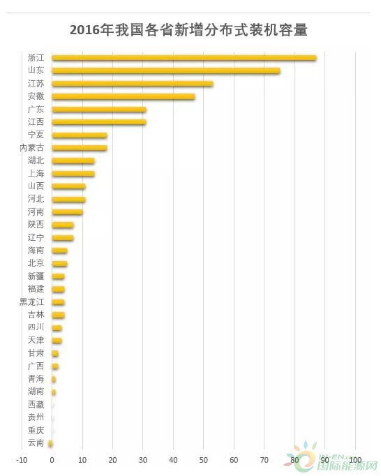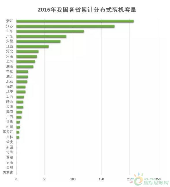 分布式方面2016年我國新增4.24吉瓦,累計10.32吉瓦。12個省份超過100兆瓦。其中,浙江新增分布式全國第一近900兆瓦。山東緊隨其后近800兆瓦。江蘇超過500兆瓦。安徽超過400兆瓦。廣東、江西超過300兆瓦。寧夏、內蒙古、湖北、上海、山西、河北超過100兆瓦。