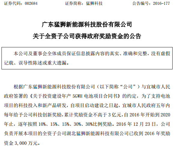 中國儲能網(wǎng)訊:猛獅科技12月23日晚間發(fā)布公告稱,公司與宜城市人民政府簽署的《關(guān)于投資建設(shè)年產(chǎn)5GWH電池項目合同書》的約定,為了支持電池項目的科技投入和新產(chǎn)品研發(fā),自項目啟動建設(shè)之日起,宜城市人民政府五年內(nèi)每年給予公司科技創(chuàng)新獎勵,累計獎勵資金不高于3億元,自2016年開始到2020年止,逐年按照10%、15%、15%、30%、30%比例獎勵。2016年12月23日,公司負責開展本項目的全資子公司湖北猛獅新能源科技有限公司已收到2016年獎勵資金3,000萬元。