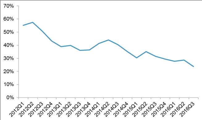 從上圖可以看出,近5年來,以季度為時間段進(jìn)行統(tǒng)計,單晶的市場份額整體呈下降的趨勢。一方面,由于日本的審批電價逐年降低,對項目經(jīng)濟(jì)性要求更高;另一方面,2016年以來日本政府對備案項目的設(shè)備選型變更的管制放松,投資商可以根據(jù)實際情況選擇性價比更高的組件。