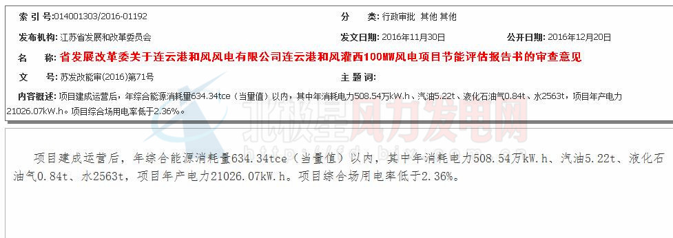 中國儲能網(wǎng)訊:江蘇發(fā)改委近日發(fā)布關(guān)于連云港和風(fēng)風(fēng)電有限公司連云港和風(fēng)灌西100MW風(fēng)電項目節(jié)能評估報告書的審查意見,以下為具體內(nèi)容: