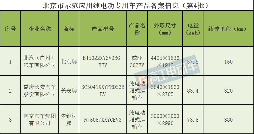 近日,北京市經(jīng)信委發(fā)布“北京市示范應(yīng)用純電動(dòng)專用車產(chǎn)品備案信息(第4批)”(下稱“第四批名單”),北汽旗下威旺307EV、重慶長(zhǎng)安旗下長(zhǎng)安純電動(dòng)廂式運(yùn)輸車、南京汽車旗下依維柯純電動(dòng)廂式運(yùn)輸車三款車型入選。