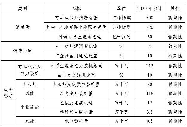 著力擴大可再生能源電力裝機規(guī)模,提高消費比重,增強消納能力,提升產(chǎn)業(yè)技術水平。到2020年,可再生能源利用量達到500萬噸標煤,占一次能源消費比重超過4%;可再生能源發(fā)電裝機達到212萬千瓦,占全市電力總裝機的10%;非水可再生能源消納電量(含外購可再生能源電量)占全社會用電量的比重達到10%。
