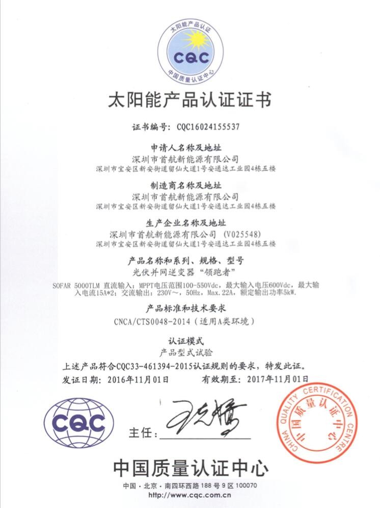 “高標(biāo)準(zhǔn),成就高品質(zhì)!”此次證書的取得,標(biāo)志著首航新能源SOFAR3000TL,SOFAR5000TLM型號(hào)光伏并網(wǎng)逆變器,已經(jīng)完全滿足“領(lǐng)跑者”相關(guān)標(biāo)準(zhǔn),研發(fā)技術(shù)達(dá)到行業(yè)領(lǐng)先水平。