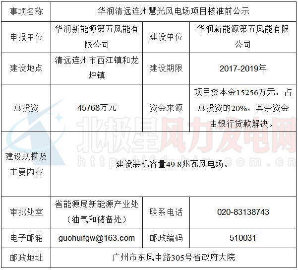 華潤(rùn)清遠(yuǎn)連州慧光風(fēng)電場(chǎng)項(xiàng)目核準(zhǔn)前公示