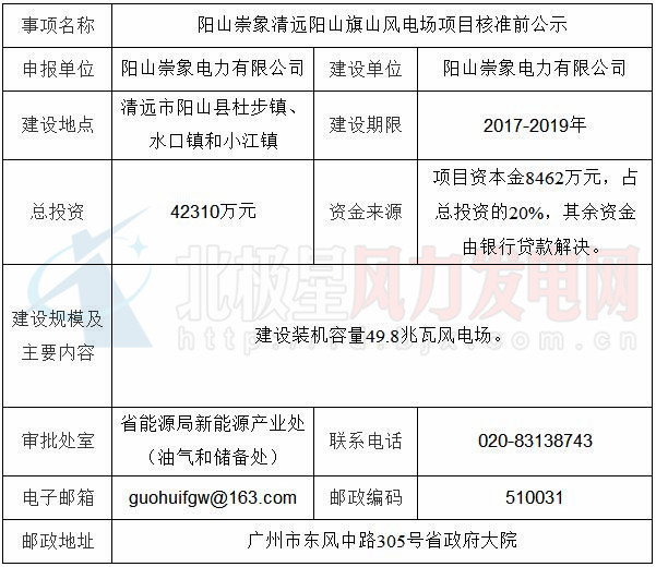陽(yáng)山崇象清遠(yuǎn)陽(yáng)山旗山風(fēng)電場(chǎng)項(xiàng)目核準(zhǔn)前公示