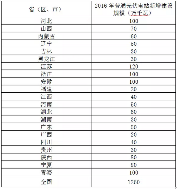 電站指標(biāo)2016年6月3日,國(guó)家能源局正式發(fā)布2016年光伏發(fā)電建設(shè)實(shí)施方案:2016年下達(dá)全國(guó)普通光伏電站項(xiàng)目1260萬千瓦,對(duì)不具備新建光伏電站市場(chǎng)條件的甘肅、新疆、云南停止或暫緩下達(dá)2016年新增光伏電站建設(shè)規(guī)模(光伏扶貧除外);山東普通光伏電站新增建設(shè)規(guī)模全部用于光伏扶貧。