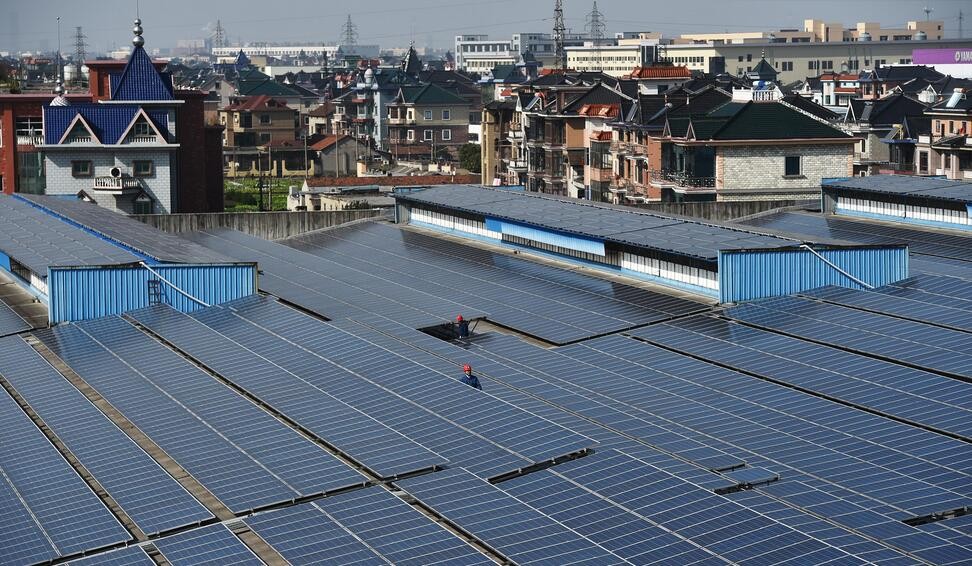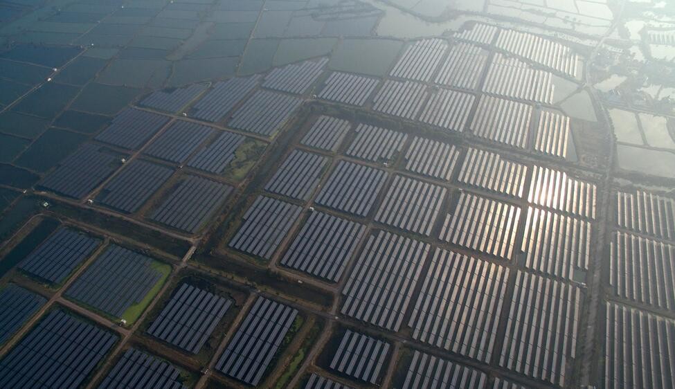 這是2016年12月3日航拍的位于浙江省湖州市南潯區(qū)和孚鎮(zhèn)漾東村的100兆瓦光伏發(fā)電項(xiàng)目。據(jù)了解,該項(xiàng)目占地4000多畝,30多萬(wàn)塊光伏組件架設(shè)在總面積2400畝的魚塘上方。 據(jù)統(tǒng)計(jì),至2016年底,浙江太陽(yáng)能發(fā)電裝機(jī)容量達(dá)338.2萬(wàn)千瓦,年發(fā)電量22.2億千瓦時(shí),同比增長(zhǎng)189.9%。