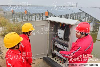 中國(guó)儲(chǔ)能網(wǎng)訊:11月21日,山東省東明縣,技術(shù)人員在中石化中原油田橋口聯(lián)合站光伏太陽(yáng)能發(fā)電項(xiàng)目現(xiàn)場(chǎng)檢查光伏發(fā)電線路運(yùn)行情況。