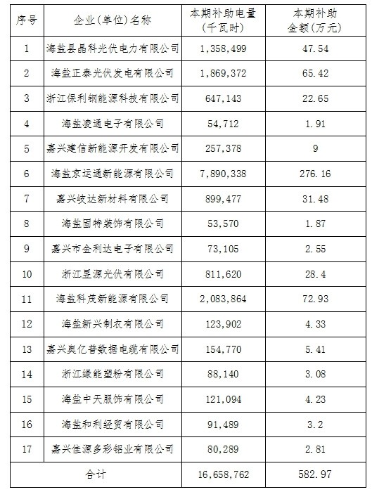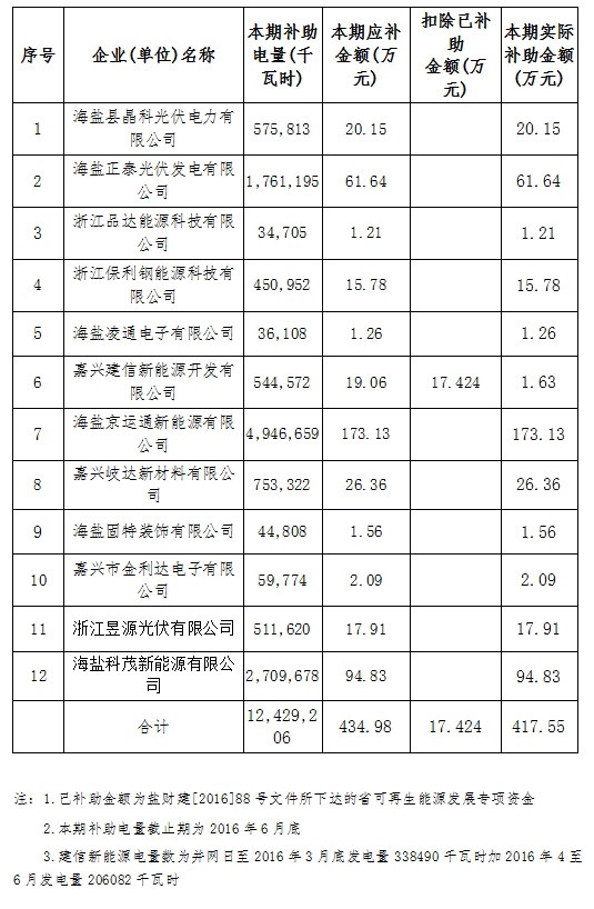 中國儲能網(wǎng)訊:近日,浙江省海鹽縣根據(jù)《海鹽縣人民政府關(guān)于印發(fā)〈2016年海鹽縣推進光伏發(fā)電應(yīng)用實施方案〉的通知》(鹽政發(fā)〔2016〕22號)精神,依照縣財政局《海鹽縣企業(yè)財政性扶持資金管理辦法》(鹽財企〔2016〕1號)規(guī)定,撥付第二批、第三批光伏發(fā)電項目投資方財政補助資金。其中,第二批光伏發(fā)電項目投資方財政補助資金417.55萬元,12家企業(yè)符合補助標(biāo)準(zhǔn);第三批財政補助資金582.97萬元,共有17家企業(yè)符合補助條件。