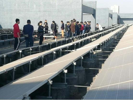 中國儲能網(wǎng)訊:12月19號的早上,天氣晴朗,陽光燦爛,位于深圳寶興電線電纜公司廠房屋頂?shù)?MW金太陽光伏示范項(xiàng)目迎來了浩浩蕩蕩的人群,他們是來自16號在深圳舉辦的第50期光伏專業(yè)技術(shù)培訓(xùn)班的學(xué)員。在古瑞瓦特技術(shù)人員的帶領(lǐng)下,學(xué)員們興高采烈,現(xiàn)場交流熱烈,氣氛融洽。即使是12月份,深圳的天氣依然炎熱,但是卻絲毫擋不住學(xué)員們對電站的參觀熱情,那么,到底是什么吸引了他們前來參觀呢?