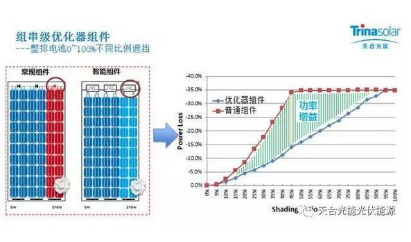 對(duì)于采用智能優(yōu)化器組件方案以后,遮擋50%的電池面積,還有50%面積是能夠正常發(fā)電。原來是損失30%的電,現(xiàn)在只有15%的損失。
