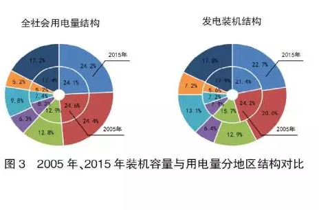 華北、華東、華中、西南、南方等電網(wǎng)的占比變化很小,2005、2015年合計(jì)占比分別為84.2%、83.8%;