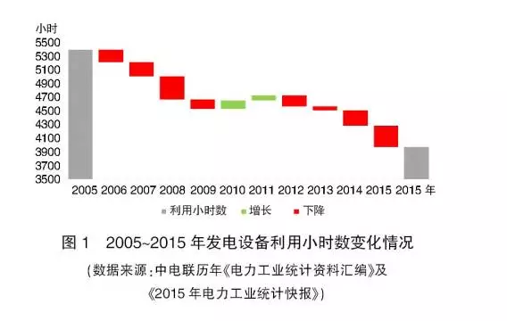 發(fā)電設(shè)備利用小時(shí)數(shù)是判斷電力供需形勢(shì)的重要標(biāo)準(zhǔn)。過(guò)去十年,發(fā)電設(shè)備利用小時(shí)數(shù)從2005年的5411小時(shí)降至2015年的3969小時(shí),僅2010年與2011年出現(xiàn)短暫小幅上漲(見(jiàn)圖1)??傮w來(lái)看,發(fā)電設(shè)備利用小時(shí)數(shù)下行是近年來(lái)的大趨勢(shì)。