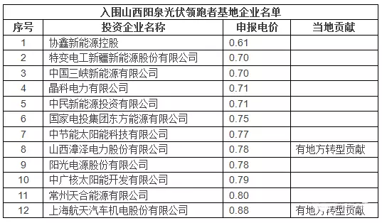 8月29日,山西省陽泉市發(fā)改委發(fā)布《山西陽泉市采煤沉陷區(qū)國家先進(jìn)技術(shù)光伏發(fā)電示范基地2016年項(xiàng)目投資商公示》,12家企業(yè)入選山西陽泉先進(jìn)光伏基地投資商,報(bào)價(jià)最低的為協(xié)鑫0.61元/kwh!