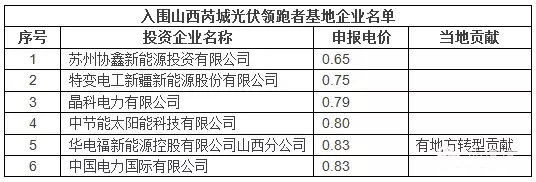 8月29日,山西芮城政府網(wǎng)站發(fā)布《山西芮城國家先進(jìn)光伏技術(shù)“領(lǐng)跑者”基地2016年項(xiàng)目投資商公示》,有6家企業(yè)入選山西芮城先進(jìn)光伏基地投資商,協(xié)鑫新能源同樣以0.65的價(jià)格成為申報(bào)電價(jià)最低的企業(yè)。