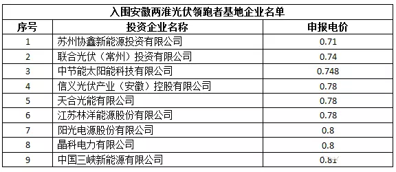 10月10日,安徽兩淮光伏領(lǐng)跑者基地中標(biāo)名單公示,9家企業(yè)入圍,最低報(bào)價(jià)為協(xié)鑫0.71元/千瓦時(shí)。