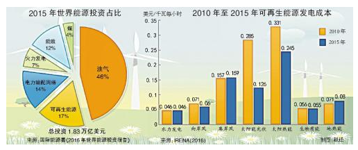 受低油價(jià)的影響,化石燃料資產(chǎn)暴跌,可再生能源利潤(rùn)率上升,化石能源與可再生能源在全球一次能源消費(fèi)結(jié)構(gòu)中的比重呈現(xiàn)出“一降一升”的發(fā)展態(tài)勢(shì)。IEA統(tǒng)計(jì)顯示,2015年全球1.83萬(wàn)億的能源投資總額中,油氣投資占比46%,與2014年相比縮水1/4??稍偕袌?chǎng)繼續(xù)穩(wěn)步上升,投資總額占比17%,同比增加1%。
