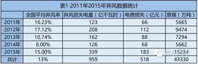 從統(tǒng)計(jì)來看,2011 年至2015 年我國棄風(fēng)電量累計(jì)損失達(dá)到959 億千瓦時(shí)(三峽、葛洲壩兩座水電站在2015 年的發(fā)電量一共是1048 億千瓦時(shí),2014 年江西省一年的全社會(huì)用電量是1018 億千瓦時(shí))。近五年平均棄風(fēng)率達(dá)到13.4%,電費(fèi)損失累計(jì)約518 億元。相當(dāng)于燒掉原煤4 億多噸,僅2015 年燒掉原煤1.5 億噸。