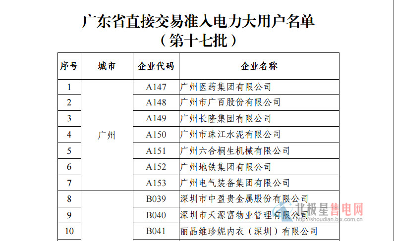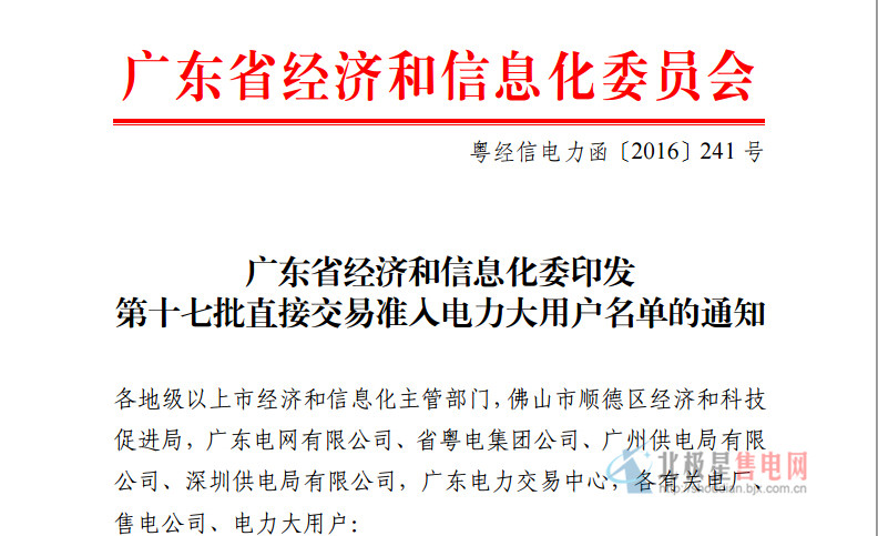 廣東省經(jīng)濟(jì)和信息化委印發(fā)第十七批直接交易準(zhǔn)入電力大用戶名單的通知