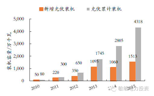 根據(jù)國(guó)家能源局發(fā)布的數(shù)據(jù),2015年,全社會(huì)用電量55500億千瓦時(shí),同比增長(zhǎng)0.5%。截至2015年底,筆者國(guó)光伏發(fā)電累計(jì)裝機(jī)容量4318萬(wàn)千瓦,其中,光伏電站3712萬(wàn)千瓦,分布式606萬(wàn)千瓦,年發(fā)電量392億千瓦時(shí)。占全社會(huì)用電量的0.7%,預(yù)計(jì)2016年全國(guó)光伏裝機(jī)總量為25GW,預(yù)計(jì)2016年光伏年發(fā)電量將達(dá)到全社會(huì)用電量1%。如果按照光伏發(fā)電量占到總用電量8%的目標(biāo)來(lái)計(jì)算,中國(guó)光伏的裝機(jī)總量將需要達(dá)到500GW的裝機(jī)規(guī)模。總投資需求為2.5萬(wàn)億元,隨著光伏電力價(jià)格的進(jìn)一步降低,光伏行業(yè)的未來(lái)才剛剛開(kāi)始。