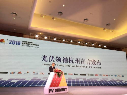 中國儲能網(wǎng)訊:2016年8月4-6日,由中國循環(huán)經(jīng)濟協(xié)會可再生能源專業(yè)委員會、中國光伏行業(yè)協(xié)會、中國可再生能源學(xué)會光伏專業(yè)委員會、中國可再生能源學(xué)會產(chǎn)業(yè)工作委員會聯(lián)合主辦的“2016光伏領(lǐng)袖峰會暨光伏投融資大會”在杭州舉辦。值此20國集團領(lǐng)導(dǎo)人峰會開幕前夕,國內(nèi)光伏行業(yè)領(lǐng)袖齊聚西子湖畔,為全球太陽能光伏產(chǎn)業(yè)可持續(xù)發(fā)展,共同發(fā)表《光伏領(lǐng)袖杭州宣言》。
