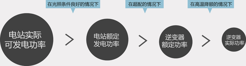 問(wèn)題又來(lái)了,通常中午也是一天氣溫最高的時(shí)候,逆變器工作環(huán)境溫度高,再加上部分廠家逆變器自身散熱差,導(dǎo)致了逆變器的降額。從6月份大同“領(lǐng)跑者”基地并網(wǎng)數(shù)據(jù)來(lái)看,很多業(yè)主發(fā)現(xiàn),在日照條件非常好的時(shí)候,其發(fā)電系統(tǒng)發(fā)電量反而下降。這是業(yè)主方始料未及的,出現(xiàn)這一問(wèn)題的原因就是逆變器的高溫降額。下圖可以清晰說(shuō)明,在光照條件良好的情況下,電站的發(fā)電系統(tǒng)發(fā)電功率是大于電站設(shè)計(jì)的額定功率的,但是在超配的情況下,逆變器的功率是小于電站額定功率的,而恰恰這個(gè)時(shí)候逆變器出現(xiàn)了高溫降額。發(fā)電效率成幾何倍數(shù)的降低,導(dǎo)致業(yè)主直接經(jīng)濟(jì)利益損失。所以部分逆變器生產(chǎn)廠家不注明具體環(huán)境溫度,來(lái)宣傳產(chǎn)品的過(guò)載能力,就是在偷換概念。