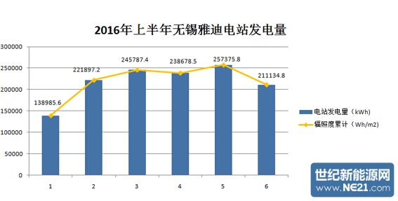 根據(jù)圖中數(shù)據(jù)可以看出,雅迪發(fā)電站的月平均發(fā)電量為21.89萬度電,由于1月正值冬季,而6月則是梅雨季,所以相比于其他幾個(gè)月份發(fā)電量有明顯減少。