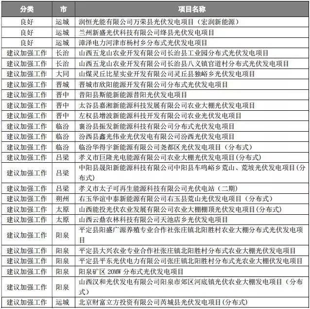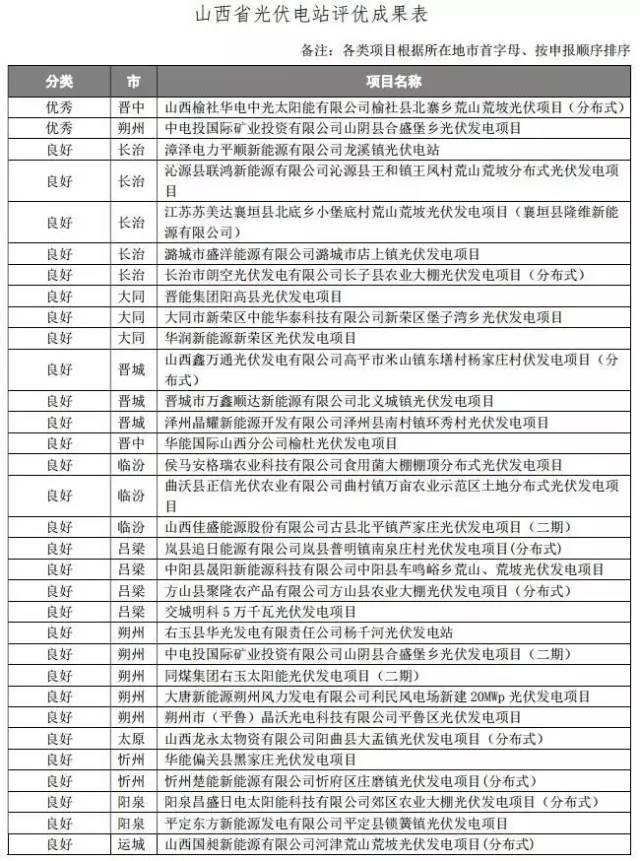 中國(guó)儲(chǔ)能網(wǎng)訊:記者從相關(guān)渠道獲悉,山西省對(duì)2016年普通光伏項(xiàng)目競(jìng)爭(zhēng)性配置評(píng)優(yōu)結(jié)果已進(jìn)行公示,57家納入合格性評(píng)審范圍內(nèi)的項(xiàng)目中,2家優(yōu)秀、33家良好、22家建議加強(qiáng)工作。其中優(yōu)秀的項(xiàng)目為山西榆社華電中光太陽(yáng)能有限公司榆社縣北寨鄉(xiāng)荒山荒坡光伏項(xiàng)目(分布式)、中電投國(guó)際礦業(yè)投資有限公司山陰縣合盛堡鄉(xiāng)光伏發(fā)電項(xiàng)目。